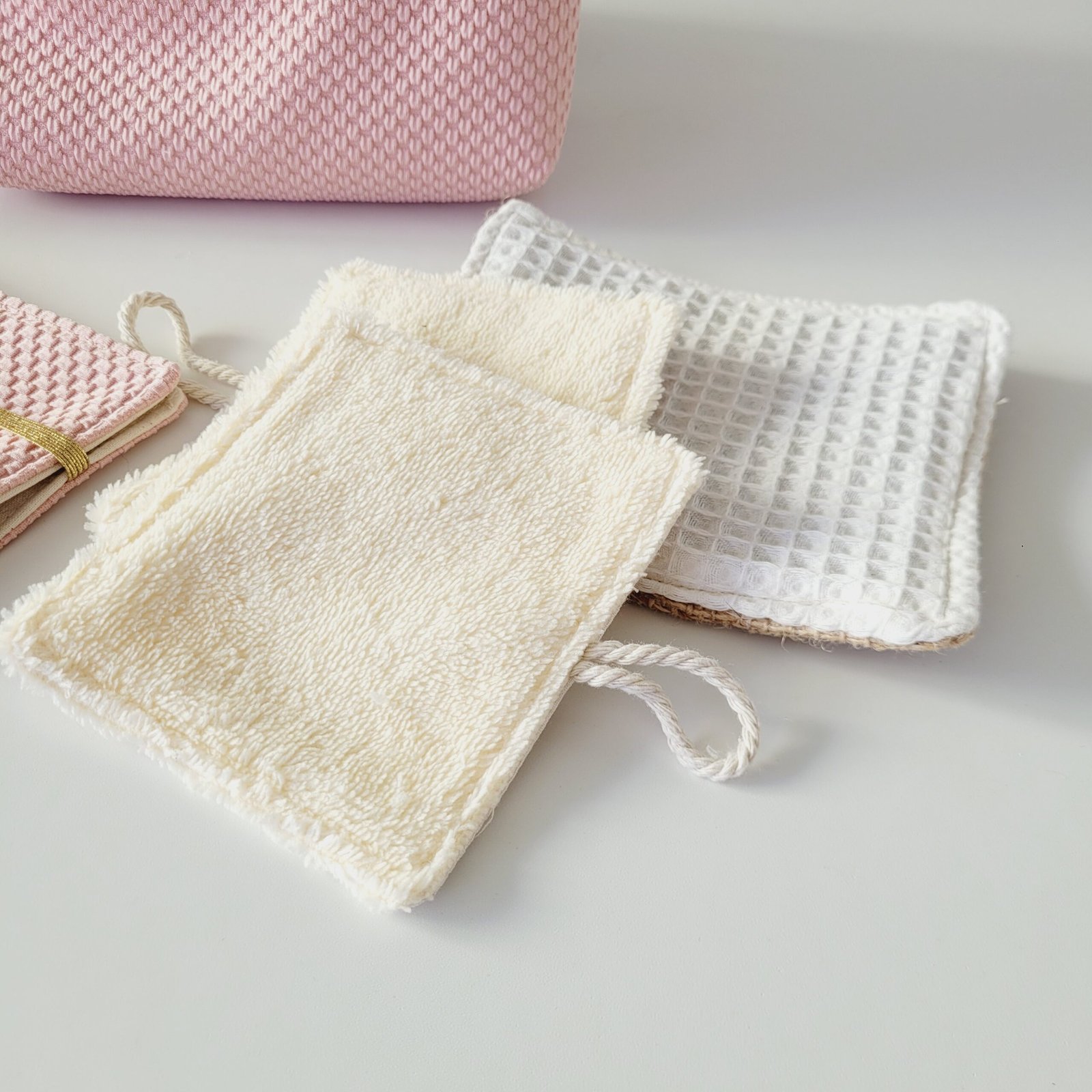 • 1 lingette exfoliante corps en coton et toile de jute : idéale pour un nettoyage plus profond, à utiliser une à deux fois par semaine.